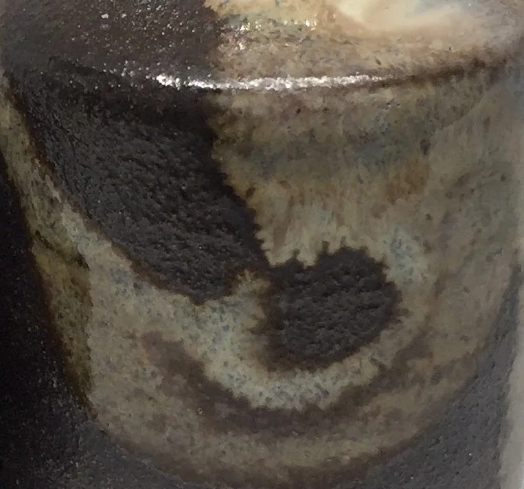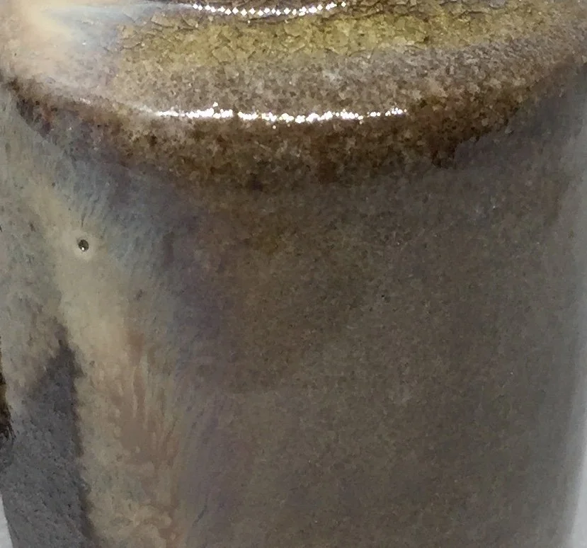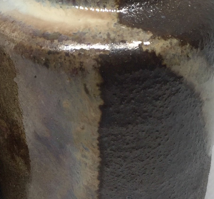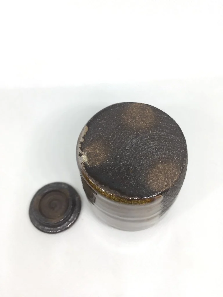 Description: The Chaire 3, tea caddy, is baked in a wood-fired kiln and adorned with a Shifuku made from Polo Ralph Lauren tie fabric and lined with kimono fabric.